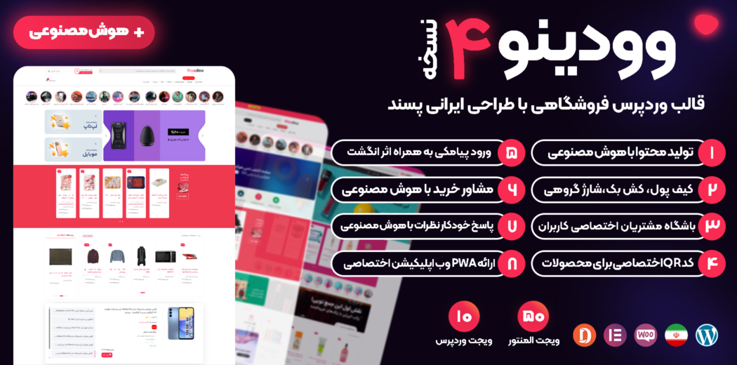 قالب وودینو یک قالب فروشگاهی وردپرس پیشرفته و کاملاً بومی است که مخصوص طراحی فروشگاههای آنلاین با ووکامرس ساخته شده و با المنتور سازگاری کامل دارد. این قالب با امکانات هوشمند مانند تولید محتوا با هوش مصنوعی، نمودار قیمت محصولات، مگامنو حرفهای، ورود پیامکی و کیف پول اختصاصی، تجربه فروش اینترنتی حرفهای را برای شما فراهم میکند.